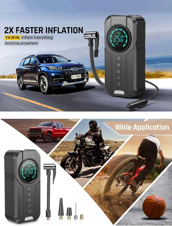 نفخ أسرع مرتين: يوفر ضاغط الهواء المحمول أقصى ضغط يبلغ 150 باوند لكل انش مربع وتدفق هواء 38 لتر/دقيقة! تحتاج فقط إلى 4 دقائق لنفخ إطار السيارة بالكامل أو 30 ثانية لإعادة ملء إطار السيارة في الوضع اليومي، يعد منفاخ إطارات السيارة المحمول هذا بالتأكيد مساعد جيد لحل حالات الطوارئ في الطريق.
