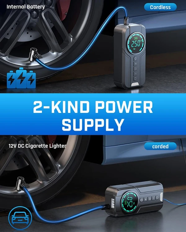 عمر بطارية طويل 6000 مللي أمبير/ساعة: ضاغط هواء محمول لنفخ الإطارات مدمج ببطارية كبيرة قابلة لإعادة الشحن 6000 مللي أمبير في الساعة. يسمح لك بنفخ أي جهاز بدون مصدر طاقة خارجي والتخلص من أسلاك الطاقة المزعجة. يمكنها نفخ 4 إطارات سيارات من أو 12 إطار سيارة بشحنة واحدة.
